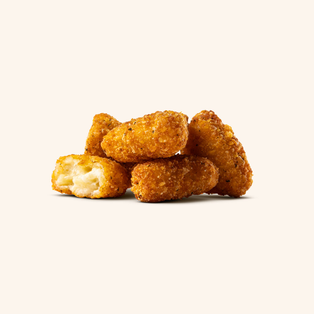 Krispiga friterade Mac & Cheese-bitar med krämig och ostig insida.