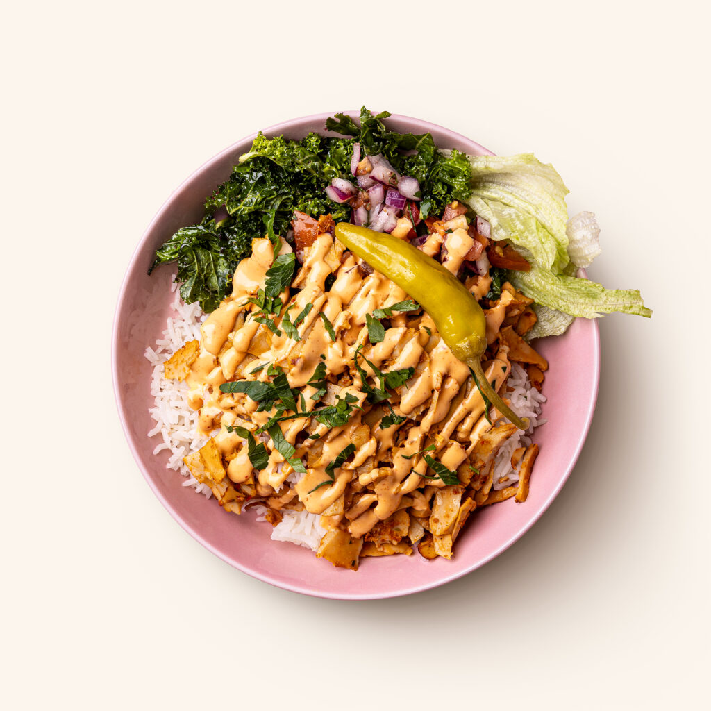 Växtbaserad kebab, grönsallad, chobansallad, ris, vegansk srirashasås, persilja och feferoni.