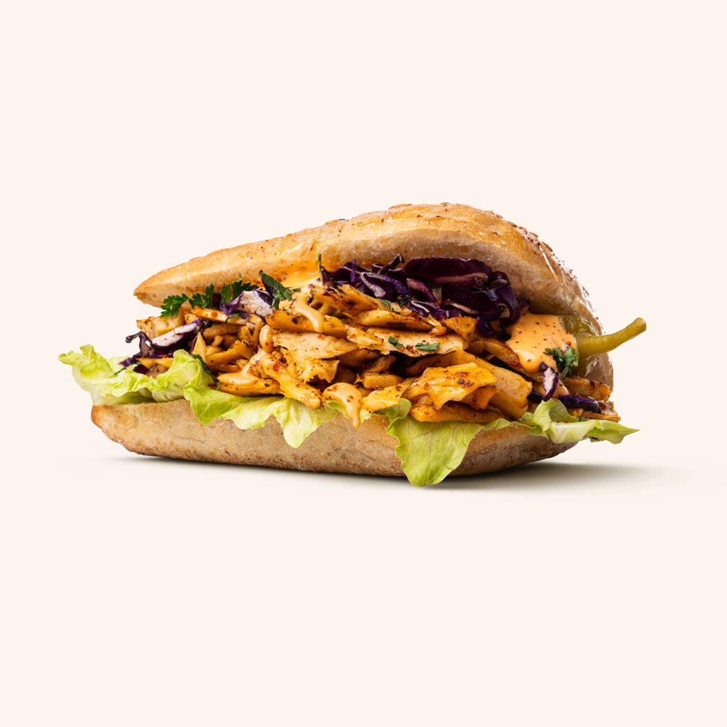 Växtbaserad kebab, pitabröd, isbergssallad, rödkål, vegansk srirashasås, persilja och feferoni.