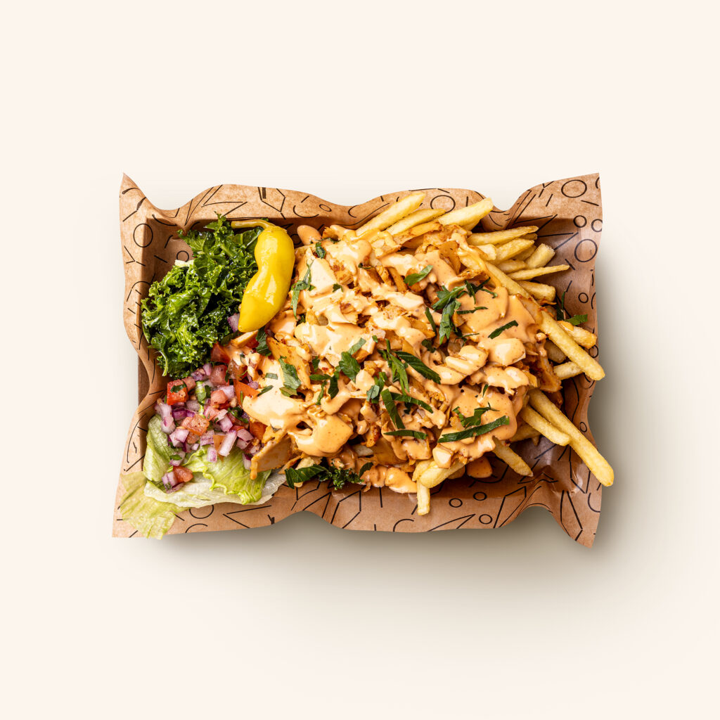 Växtbaserad kebab, pommes, isbergssallad, grönsallad, chobansallad, vegansk srirashasås, persilja och feferoni.